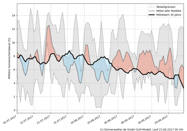 Anders als die Niederschlagsmengen stechen die Abweichungen bei den Mitteltemperaturen in den kommenden Wochen deutlich hervor. Sie liegen zwischen Anfang Juli und Ende August meist unter den langjährigen Mittelwerten. Die Sonnenscheindauer legt, wie in der letzten Grafik zu erkennen, eine Berg- und Talfahrt hin - eine sehr sonnige Phase deutet sich dann aber ab Ende August an.