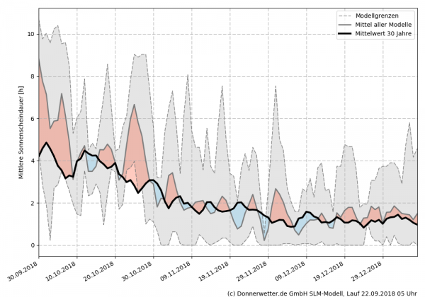 Morgen der 23.09.2018 ist der offizieller kalendarischer Herbstanfang der Nordhalbkugel. Wie man sieht fangen langsam die Bäume an ihre Blätter zu verlieren. Bis zum Ende des Monats Oktober ist mit überdurchschnittlichen Lufttemperaturen zu rechnen. Auch die Grafik der Sonnenstunden zeigt sehr viele Sonnentage, die von der Niederschlagsgrafik unterstützt wird. Das lässt auf einen schönen Herbst schließen.