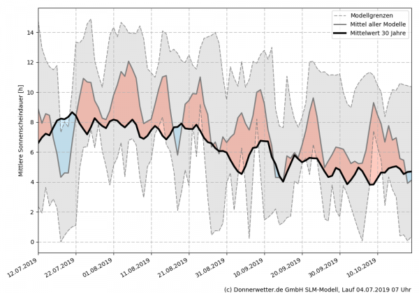 Nach einer jahreszeitlich eher unterdurchschnittlich temperierten Phase, ziehen die mittleren Lufttemperaturen im kommenden Monat im Süden wieder an. Markant zeigt sich in den aktuellen Langfristprognosen vor allem die Berechung der zu erwartenden Sonnenstunden - treffen sie so ein, erwartet uns in den kommenden Wochen und Monaten ein Sonnenfestival.