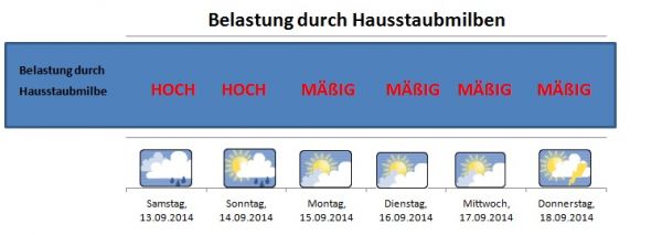 Das feuchte und milde Wetter zu Beginn des Wochenendes lässt die Luftfeuchtigkeit in unseren Wohnräumen ansteigen. Damit sind am Wochenende die Milbenbelastungen recht hoch und sinken mit der neuen Woche dann langsam wieder ab.