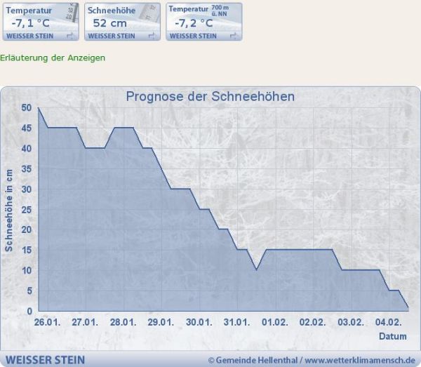 Aktuell liegt an unserer Wetterstation am Weißen Stein in der Eifel eine Schneedecke in Höhe von 52 cm. Die Prognose allerdings zeigt, dass der Schnee in den nächsten Tagen abnehmen soll. Also nutzen Sie die nächsten Tage noch gut für wintersportliche Aktivitäten. Diese können Sie perfekt am Weißen Stein. Mehr Infos dazu finden Sie hier.
