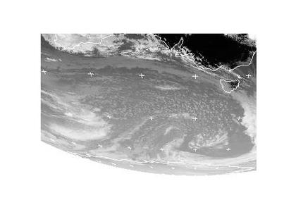 Das Satellitenbild zeigt einen riesigen Tiefdruckwirbel zwischen der Antarktis und dem Süden Australiens. Gut zu erkennen ist die Schauerbewölkung im Kaltluftbereich. Die Kaltfront dieses Tiefdruckgebietes hat bereits Tasmanien erreicht und zieht nun weiter nach Australien. Zum Vergleich: Dieser Wirbel hätte auf der Nordhalbkugel eine Ausdehnung von Grönland bis nach Nordafrika!