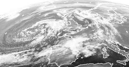 Das Zentrum von Tief 'Helene', einem ehemaligen tropischen Wirbelsturm, liegt auf dem Atlantik, westlich von Irland, in der Spirale schauerartiger Bewölkung. Das Tief bestimmt das Wetter über Westeuropa. In dem Wolkenband, das sich von den Azoren über Frankreich und Deutschland bis nach Norwegen erstreckt, ist eine Kaltfront zu erkennen. Sie ist jedoch nicht immer deutlich ausgeprägt und die Bewölkung ist, wie über Deutschland teils aufgelockert. (Bildquelle: NERC Satellite Receiving Station, Dundee University, Scotland, http://www.sat.dundee.ac.uk/)
