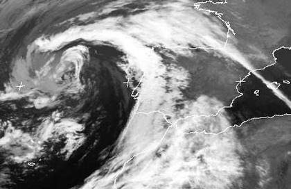Auf dem Atlantik befindet sich, westlich von Portugal, das Tief 'Nando'. Auf dem Satellitenbild von Freitagmorgen liegt seine Warmfront zu großen Teilen über der Biskaya. Ein schmaler Streifen reicht sogar über Mallorca hinweg bis nach Nordafrika. Die Kaltfront überzieht heute vor allem Portugal und Westspanien mit zum Teil kräftigen Schauern.