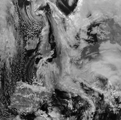 Tiefdruckgebiete bestimmen das Wetter über weiten Teilen Europas. Ein langes und dichtes Wolkenband erstreckt sich von der Nordsee über Westdeutschland bis nach Norditalien. Im Bereich dieses Wolkenbands liegt die Grenze zwischen Kaltluft im Westen und milderer Luft im Osten. Weiter nach Westen oder Osten gibt es auch einige Gebiete mit geringerer Bewölkung. Sowohl über dem Atlantik wie auch über dem Mittelmeer findet man zahlreiche lockere Schauerwolken.