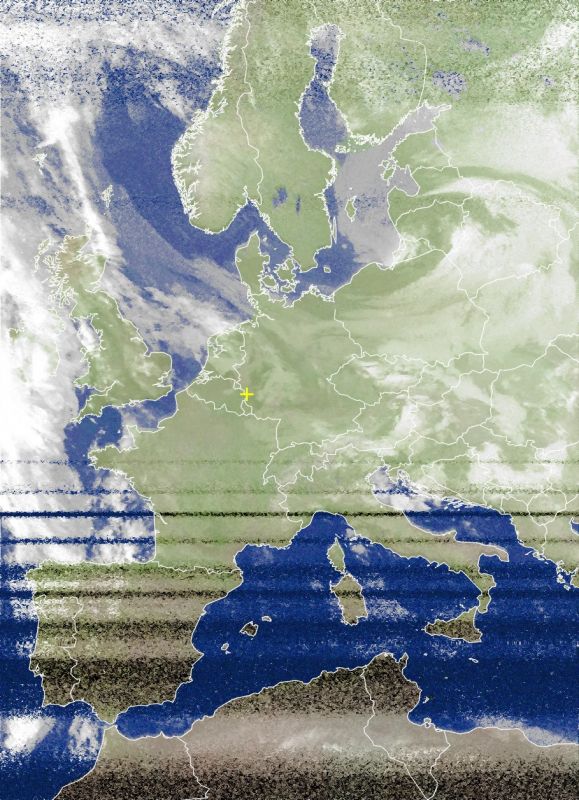 Über Deutschland zeigen sich aus Sicht des in 800 km Höhe ziehenden polarumlaufenden Satelliten ziemlich wolkig. Regen fällt kaum noch. Über der Ostsee klart es schon auf und auch in Mecklenburg-Vorpommern war es schon teilweise sonnig.