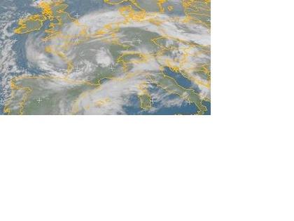 Ein dichtes Wolkenband erstreckt sich von der Nordsee über Norddeutschland und Dänemark bis nach Polen. Es gehört zu einem Tief über Westfrankreich und sorgt gebietsweise für Regen oder Schneefall. Auf seiner Rückseite sind zunehmend auch heitere Abschnitte möglich. (Bildquelle: EUMESAT)