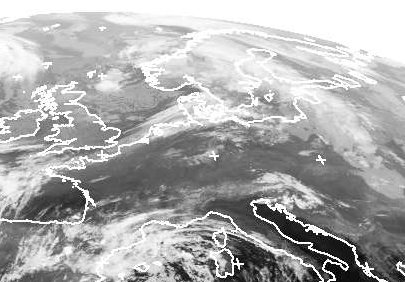 Über Schweden liegt das Tief 'Lilly', dessen Kaltfront an dem Wolkenband zu erkennen ist, das sich über Dänemark und die Niederlande bis an den Ärmelkanal erstreckt. Sie zieht heute nach Deutschland herein. Dabei kommt es zu teils kräftigem Regen oder Gewittern. Weiter südlich ist es unter dem Einfluss von Hoch 'Hermann' noch meist gering bewölkt. Auch dahinter lockert es im Norden wieder auf. (Bildquelle: NERC Satellite Receiving Station, Dundee University, Scotland, http://www.sat.dundee.ac.uk/)