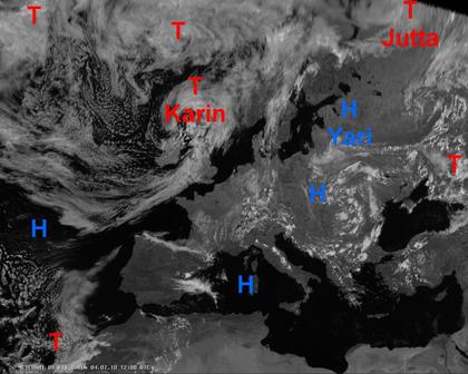 Das Satellitenbild zeigt, dass Europa weiterhin von Hochdruckeinfluss beherrscht wird. Ein kräftiges Tiefdruckgebiet sorgt bei Großbritanien besonders in Schottland für teils kräftige Schauer oder Gewitter. Auch am östlichen Schwarzen Meer bringt ein Tiefdrucksystem Schauer und Gewitter.