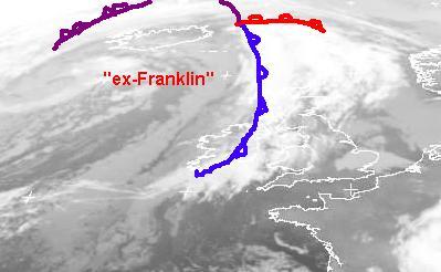 Auf dem Satellitenbild von Dienstag früh ist der ehemalige tropische Sturm 'Franklin' (jetzt ex-Franklin'), der sich in der Karibik gebildet hat und dann parallel zur Nordamerikanischen Ostküste nach Norden zog, bei Island zu erkennen. Seine Fronten reichen vom Atlantik in die Nordsee (Warmfront) und bis Großbritannien (Kaltfront). Morgen wird die Kaltfront voraussichtlich auch Deutschland erreichen und dort wieder Schauer und Gewitter bringen.