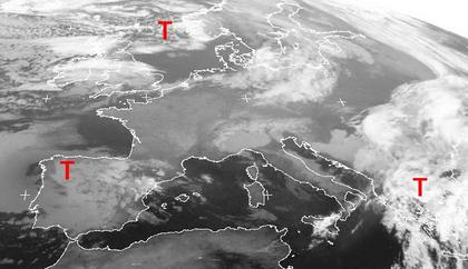 Weite Teile von Frankreich bis Russland sind unter Hochdruckeinfluss fast wolkenfrei. Daneben sorgen Tiefdruckgebiete westlich von Norwegen, über der Iberischen Halbinsel und Griechenland für Wolken und zeitweiligen Regen.