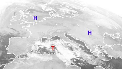 Im Mittelmeer bringt ein Tiefdruckgebiet örtlich Schauer oder Gewitter von den Balearen bis Sizilien. Sonst sorgt Hochdruckeinfluss in weiten Teilen Europas für teils freundliches, teils aber auch trübes Wetter. Vor allen über Norddeutschland liegt eine dichte Hochnebeldecke aus der örtlich Sprühregen fällt. (Bildquelle: NERC Satellite Receiving Station, Dundee University, Scotland, http://www.sat.dundee.ac.uk/)