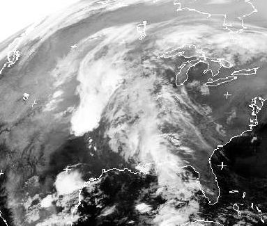 Ein Tief über dem mittleren Westen bringt Wolken von der Golfküste bis an die Hudson Bay. Vor allem westlich des Mississippi erkennt man die hochreichende Bewölkung kräftiger Gewitter.