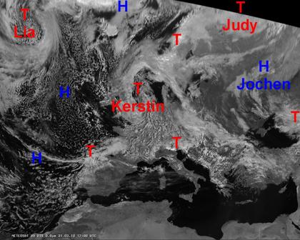 Auf dem Satellitenfoto von heute Nachmittag zeigen sich Tiedruckgebiete von West- über Mittel- bis nach Südosteuropa. Bei wechselnder und teils starker Bewölkung sind hierbei verbreitet Schauer, teils auch mit Graupel, möglich. Gebietsweise treten auch Gewitter auf. Auch in Nordeuropa dominiert Tiefdruckeinfluss mit meist dichten Wolken und gelegentlichem Regen. In Osteuropa bringt Hochdruckeinfluss meist trockenes und teils auch freundliches Wetter. Am freundlichsten und weitgehend trocken ist es rund ums Mittelmeer. Hier scheint die Sonne meist den ganzen Tag.