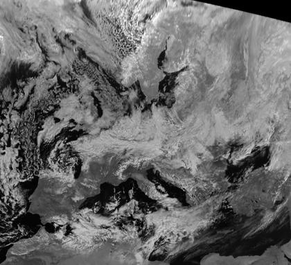 Mittel-, Ost- und Nordeuropa liegen im Einflussbereich von Tief 'Christa' mit Zentrum über Lappland und Tief 'Brigitte' mit Zentrum über Nordrussland. Vor der Norwegischen Küste ist an der zellulären Bewölkung nach Süden strömende, labilisierte Kaltluft erkennbar. West- und Südwesteuropa liegen zunehmend im Bereich von Hoch 'Isidor', und zeigen sich zu großen Teilen wolkenarm. Die Alpen mit teils schon schneearmen Tälern sowie die großen Seen wie der Genfer See und der Gardasee sind erkennbar.