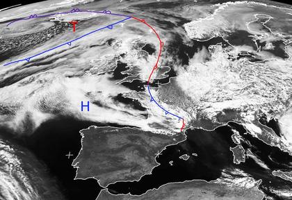 Hoch 'Jürgen' liegt heute Mittag mit seinem Zentrum südwestlich der Britischen Inseln. Während es in Spanien für verbreitet wolkenlosen Wetter sorgt, haben sich über dem Meer einige Hochnebelfelder gebildet. Bei Island liegt Tief 'Sylvia' mit seinen Ausläufern. Ein Ausläufer liegt dabei quer über den Britischen Inseln und Frankreich. Aus diesem Ausläufer löst sich bei der Umströmung um die Alpen in südöstlicher Richtung ein Teiltief ab, das im Mittelmeerraum für Schauer und Gewitter sorgen wird. Über Deutschland liegt noch wolkenreiche Luft, die in einer nördlichen Strömung eingeflossen ist. Sie gerät nun zunächst unter Hochdruckeinfluss, schon am Freitag Nachmittag erreicht die Warmfront des Tiefs 'Sylvia' über den Britischen Inseln aber den Westen Deutschlands.