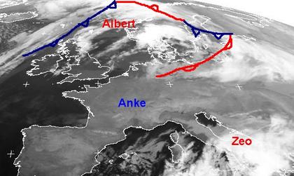 Das Tief „Zeo“ liegt über dem Ionischen Meer und sorgt weiterhin für teils kräftige Regenfälle auf dem südlichen Balkan und in Süditalien; die Regenwolken des Tiefs reichen sogar bis nach Nordafrika. Vom Atlantik über die Alpenländer bis zum Schwarzen erstreckt sich eine Hochdruckbrücke und sorgt für teils heiteres, teils auch trübes Wetter. Über Nordeuropa halten sich dichte Wolken des neuen Tiefs „Albert“, seine Warmfront überquert heute Norddeutschland, Polen und die Baltikländer mit Regen oder gefrierendem Regen.