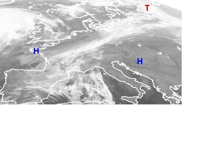Auf dem Satellitenbild von Montag früh erstreckt sich ein Wolkenband von Frankreich über die Mitte Deutschlands bis ins Baltikum. Es beinhaltet die Ausläufer eines Tiefs über Russland und sorgt gebietsweise noch für Regen. Nördlich und südlich dieses Wolkenbands sorgt Hochdruckeinfluss vor allem in Südosteuropa für meist freundliches und trockenes Wetter. (Bildquelle: NERC Satellite Receiving Station, Dundee University, Scotland, http://www.sat.dundee.ac.uk/)