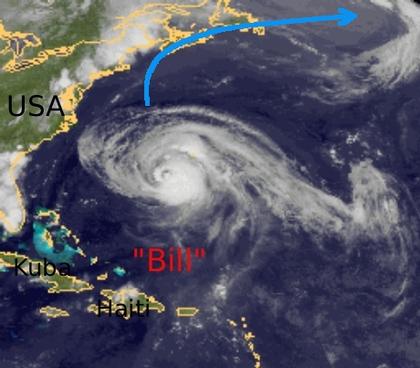 Hurrikan 'Bill' über dem westlichen Atlantik hat sich etwas abgeschwächt und erreicht nur noch die Stufe 2 auf der fünfteiligen Hurrikanskala. Die mittlere Windgeschwindigkeit liegt bei 166 km/h. Während die Ostküste der USA vom Wirbelsturm bei seinem Weg nach Nordosten vermutlich verschont bleibt, zieht 'Bill' nun auf Neuschottland und Neufundland zu. Bis er dort ist, wird er sich voraussichtlich aber weiter abschwächen.