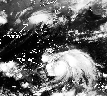 Der tropische Sturm 'Cindy' ist am Mittwoch auf die Küste von Louisiana getroffen und verlagert sich unter Abschwächung entlang der Appalachen nach Nordosten. Der Hurrikan 'Dennis' über dem Karibischen Meer zieht nach Nordwesten und streift heute mit Windgeschwindigkeiten von 150 bis 190 km/h die Küste von Jamaika und Haiti, morgen überquert er Kuba und wird zu Beginn der nächsten Woche im Golf von Mexiko erwartet.