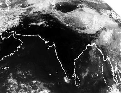 Auf dem Satellitenbild von Mittwoch früh sind Indien und die nördlicheren Regionen nahezu wolkenfrei. Gut zu erkennen ist auch der Verlauf des Himalayagebirges, dass sich mit seinen kühleren Temperaturen (im Infrarotbereich heller dargestellt) deutlich vom wärmeren Indien abhebt. (Bildquelle: NERC Satellite Receiving Station, Dundee University, Scotland, http://www.sat.dundee.ac.uk/)