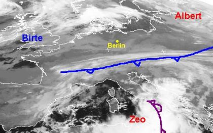 Die Kaltfront des Tiefs „Albert“ über Nordwestrussland erstreckt sich auf dem Satellitenbild vom Dienstag morgen von der Ukraine über die Alpenländer bis nach Frankreich. Weiter nördlich sorgt schwacher Hochdruckeinfluss für ruhiges Wetter, gebietsweise halten sich Nebel- oder Hochnebelfelder. Das Höhentief „Zeo“ bleibt weiterhin wetterbestimmend von Süditalien bis nach Nordafrika mit feuchter Luft, am Mittwoch wird es sich wieder verstärken und für zum Teil kräftigen Regen und Wind vor allem in Tunesien sorgen.