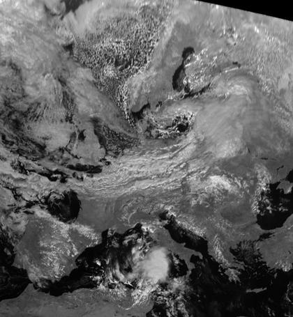 Über der Ostsee liegt das Zentrum des Tiefdruckwirbels 'Ralf'. Seine Kaltfront erstreckt sich von Polen über Deutschland bis nach Nordfrankreich. In ihrem Bereich liegen viele Wolken. Sie bewegt sich langsam südwärts, dabei strömt von Norden kühle Luft nach. Über der Nordsee hat sich im Bereich dieser Kaltluft das lockere Muster zahlreicher Schauerzellen gebildet.