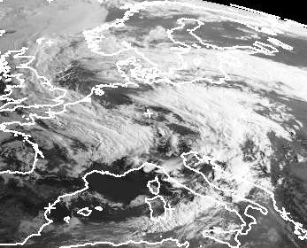 Über Deutschland liegt ein ein Gebiet hochreichender Kaltluft, das durch ein Höhentief gekennzeichnet ist. Die meisten Wolken (und der meiste Regen!) bilden sich aber an seinen Rändern, hier im Südwesten und im Nordosten Deutschlands zu erkennen. In der Mitte ist es eher aufgelockert. (Bildquelle: NERC Satellite Receiving Station, Dundee University, Scotland, http://www.sat.dundee.ac.uk/)