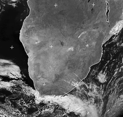 Über dem südlichen Afrika ist es verbreitet wolkenlos. Nur im äußersten Süden ist eine Kaltfront mit ihren Wolken vom Südpolarmeer her aufgezogen. Hier kommt es auch zu etwas Regen.