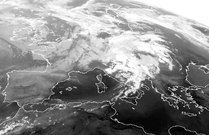 Die Wolken, die sich von der Adria bis zu den Karpaten und Polen erstrecken gehören zu dem kleinen Tief 'Eric' mit seinem Zentrum über Tschechien. Sie sorgen dort heute für zum Teil kräftige Schauer. Von Südskandinavien über Dänemark bis nach Süddeutschland erstreckt sich eine Kaltfront die sich langsam weiter nach Osten bewegt. Dieser Kaltfront folgt wolkenreiche und etwas kühlere Meeresluft nach. Über der Iberischen Halbinsel sorgt Hochdruckeinfluss für eine nur leichte Bewölkung.