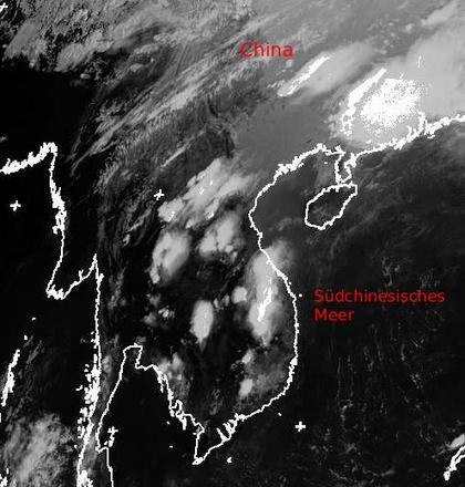 Das Satellitenfoto von Samstag Mittag zeigt über Südostasien teils mächtige Gewitterwolken, die sich als hell dargestellte Wolkencluster deutlich vom warmen und dunkel dargestellten Untergrund abheben. Vor allem über Thailand, Laos, Vietnam und Südchina kommt es dabei auch zu heftigem Regen. Über dem Südchinesischen Meer hingegen befinden sich kaum Wolken, hier reicht die Erwärmung des Meereswassers nicht zur Konvektion aus, so dass die Wolkenbildung weitgehend ausbleibt. (Bildquelle: NERC Satellite Receiving Station, Dundee University, Scotland, http://www.sat.dundee.ac.uk/)