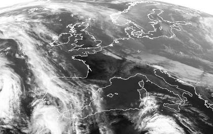 Das Satellitenbild zeigt das Wolkenband an der Grenze zwischen kalter Festlandsluft und feucht-milder Meeresluft, die von der westlichen Nordsee über Belgien, Nordfrankreich und Südwest-Deutschland bis zum Balkan verläuft. Im Nordosten Europas ist der Winter noch in vollem Gange, im Westen und Südwesten ist es dagegen frühlingshaft mild.