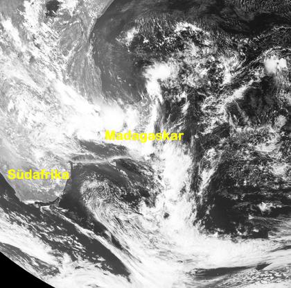 Ein Tiefdrucksystem bringt von Teilen des südlichen afrikanischen Kontinents bis nach Madagaskar und in südlicher Richtung davon teils ergiebigen Regen oder kräftige Gewitter. Fast erscheint die Form der Wolkenbänder wie zwei geschwungene Flügel. Auf der Südhalbkugel ziehen Tiefdruckgebiete wie auf der Nordhalbkugel von West nach Ost, die Drehrichtung innerhalb des Systems ist jedoch umgekehrt. daher ziehen Fronten meist an der nördlichen Seite des Tiefdruckkerns entlang. (Bildquelle: NERC Satellite Receiving Station, Dundee University, Scotland, http://www.sat.dundee.ac.uk/)