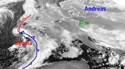 Das Hoch „Andreas“ über Skandinavien und Nordwestrussland sorgt für ruhiges und kaltes Wetter in weiten Teilen Mittel-, Ost- und Nordeuropas, neben Nebel und Hochnebel kann es hier und da auch auflockern, auf dem Satellitenbild vom Freitagmorgen sind teilweise die Alpen sichtbar. Von der Biscaya über die Iberische Halbinsel bis nach Marokko erstreckt sich die Kaltfront von Tief „Bettina“, auf seiner Rückseite haben sich vermehrt Schauerwolken entwickelt, sie sind sehr gut über dem östlichen Atlantik zu erkennen.