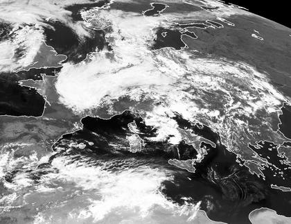 Fast das gesamte Mitteleuropa liegt heute Mittag unter dichten Wolken, aus denen es entweder regnet oder sich Schauer und Gewitter bilden. Auch über Italien bis bis zur Ukraine und nach Nord-Griechenland befinden sich viele Wolken. Hier bringen kräftige Schauer und Gewitter nicht nur Abkühlung, sondern auch eine teilweise Entspannung der wochenlangen Waldbrände.