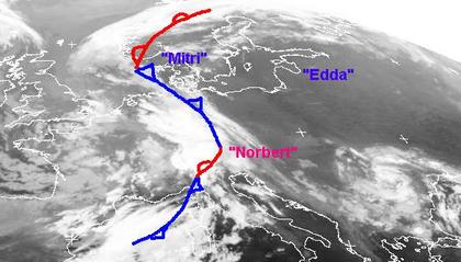 Während es in Osteuropa unter dem Einfluss des Hochs 'Edda' über dem Baltikum wolkenarm bleibt, bringt das Tief 'Mitri' mit Zentrum über der Nordsee Regen und Gewitter in West- und Mitteleuropa. Entlang der Kaltfront des Tiefs, die sich von seinem Zentrum bis nach Italien erstreckt, baut sich das neue Tief 'Norbert' über dem Alpenraum auf, in den nächsten Tagen sorgt es für viel Regen in der Region.