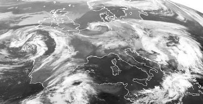Zwei Tiefs gestalten das Wetter wechselhaft in Mittel- und Westeuropa. Das eine von ihnen mit dem Namen 'Florian' liegt genau über Deutschland, Wolken seiner Warmfront reichen bis nach Osteuropa, über Norddeutschland liegt die Okklusionfront des Tiefs. Das zweite Tief 'Horst' kann man sehr gut an einer Wolkenspirale über der Biscaya erkennen, die Kaltfront des Tiefs hat bereits die französische Westküste erreicht.
