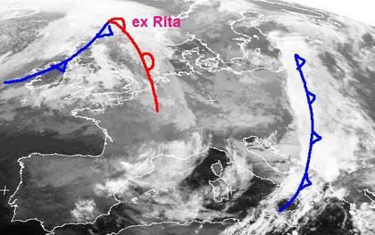 In weiten Teilen Mittel- und Westeuropa sorgen atlantische Tiefausläufer für wechselhaftes Wetter. Vom Baltikum bis zum Balkan erstreckt sich ein Wolken- und Regenband, er gehört einem Tief über der Kola Halbinsel. Unter schwachem Zwischenhochdruckeinfluss lockern die Wolken von Frankreich bis nach Deutschland vorübergehend etwas auf, über den Britischen Inseln und Benelux liegen Regenwolken des Tiefs 'ex-Rita', am Samstag werden sie in Deutschland erwartet.