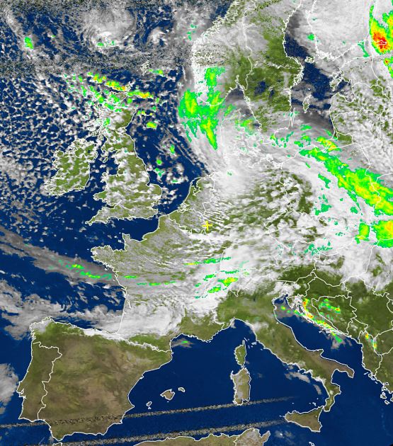 Auf dem Satellitenfoto von heute Nachmittag ist das Zentrum des Sturmtief "Niklas" über Dänemark zu erkennen. Die teils ergiebigen Regenfälle sind inzwischen weiter nach Osteuropa abgezogen, jedoch erkennen wir die typische Cumulusbewölkung (Haufenwolken) über weiten Teilen Mitteleuropas bis zu den Britischen Inseln. Hierbei kommt es zu teils kräftigen Schauern, nicht selten mit Schnee oder auch Graupel. Dazu weht weiterhin ein stürmischer Wind, selbst im Flachland besteht die Gefahr einzelner orkanartiger Böen.