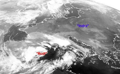 Während weite Teile von Mittel- und Osteuropa durch Hoch 'Indra' fast Wolkenfrei sind sorgt Tief 'Rudi' im Mittelmeer für viele Wolken mit zum Teil kräftigen Schauern und Gewittern in Spanien, Südfrankreich und Italien. Auch über Großbritannien und Skandinavien bringt Tiefdruckeinfluss Wolken und Regen.