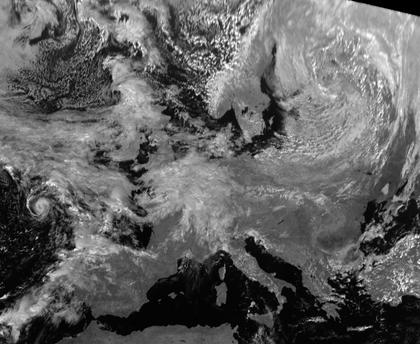 Auf dem Satellitenbild sind über Frankreich, Benelux und Deutschland die Wolken eines typischen verbreitet Regen bringenden Tiefdruckgebietes zu sehen. Vor der Biskaya ist ein kleines Tiefdruckgebiet in der typischen Spiralform sehr schön erkennbar. Über dem südlichen Schweden halten sich nur wenige Wolken, so dass die großen Seen erkennbar sind.