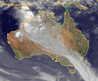 Über dem Nordwesten Australiens liegt noch der alte Zyklon 'Laurence', der sich aber bereits stark abgeschwächt hat. Es kommt in seinem Bereich aber noch zu teils starken Regenfällen und Gewittern. Von dem Zyklon ausgehend erstreckt sich ein Wolkenband zum Tiefausläufer eines Tiefs über dem Südpolarmeer, der von Südwesten auf den australischen Kontinent gezogen ist. Auch in seinem Bereich kommt es über Südostaustralien teils zu Regen oder auch Gewittern.