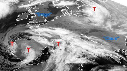 Tiefdruckgebiete über der Iberischen Halbinsel und dem westlichen Mittelmeer sorgen für Regen und Schnee von Frankreich und Spanien, sowie in Italien und Nordafrika. Auch über Russland bringt ein Tief noch Schneefälle. Dazwischen sorgen Hoch 'Drago' über Schottland und Hoch 'Claus' über Bulgarien für ruhiges, teils aber auch trübes Wetter.