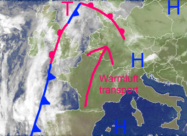 Hinter der über Nordostdeutschland liegenden Warmfront, gelangt für die Jahreszeit ungewöhnlich warme Luft aus Südwesteuropa zu uns. Während sich dabei im Bereich der Front noch kompakte Schichtbewölkung mit etwas Regen, oder Sprühregen hält, strahlt über weiten Teilen Mittel- und Südeuropas die Sonne. Verbreitet erwärmt sich die Luft am Nachmittag auf 20 Grad. In Südwestfrankreich werden heute sogar schon frühsommerliche 25 Grad gemessen.