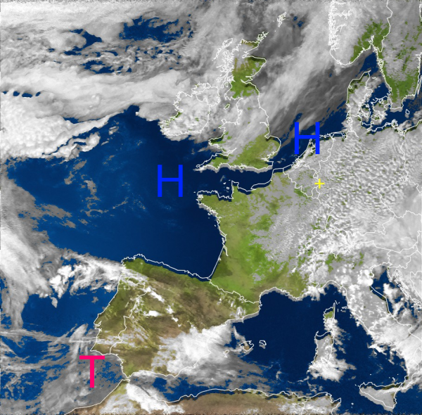 Die große wolkenfreie Fläche über dem Ostatlantik ist dank eines Hochs entstanden. Dieses Hoch legt sich morgen über Mitteleuropa und bewirkt auch hier ein Auflösen der Wolken. Die Sonne kommt also wieder zum Zuge.