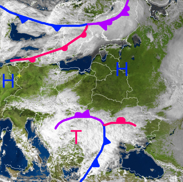 Dazwischen befindet sich die Hochdruckzone, welche heute in großen Gebieten unseres Landes bei nur wenigen Wolken die Sonne scheinen ließ.