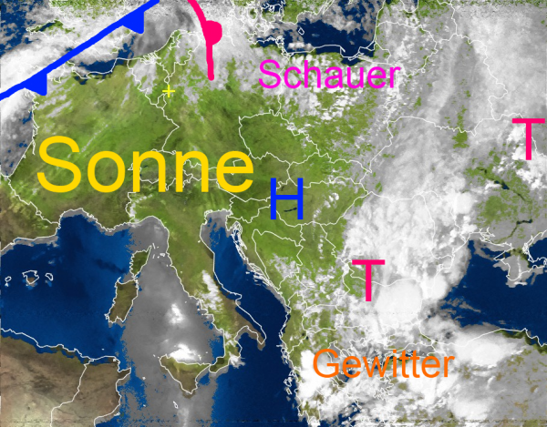 Der Süden und die Mitte Deutschlands profitieren von dem bereits über Ungarn angelangtem Zwischenhoch. Verbreitet strahlt die Sonne von einem meist nur leicht bewölkten Himmel bei angenehmen Temperaturen.