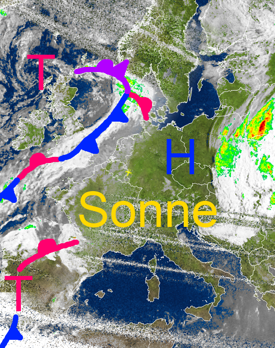 Das Zwischenhoch über Ostdeutschland sorgt heute für blauen Himmel und reichlich Sonnenschein. Es muss jedoch bald schon wieder das Feld räumen. Das Tief, das momentan noch über Spanien liegt wandert über Frankreich hinweg und erreicht bis morgen Abend unter Verstärkung die Nordsee. Seine Wolken erfassen hauptsächlich den Süden und die Westhälfte unseres Landes. Dabei kann es teilweise wieder zu kräftigen gewittrige Regenfälle kommen.