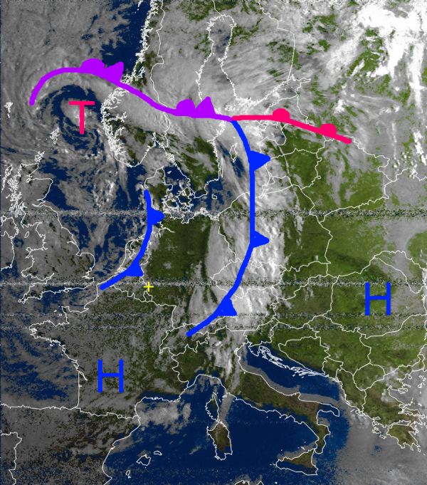 Zwischen den Fronten in Deutschland gibt es eine größere wolkenfreie Zone mit Sonnenschein. Die über Osteuropa angelangte Kaltfront brachte gestern und in der Nacht teils kräftige gewittrige Regengüsse und auch dem Südosten des Landes wohltuende Abkühlung. Die Höhenkaltluft sorgt aktuell im Nordwesten für einige teils kräftige Schauer.