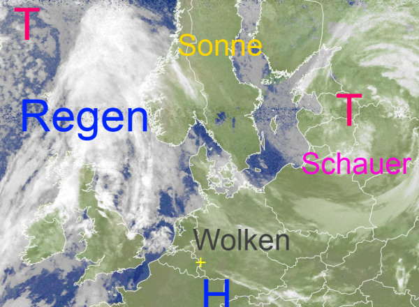 Deutlich ungemütlicher ist das Wetter über dem Nordatlantik und Teilen von Großbritanniens. Auch über dem Baltikum wirbelt ein kräftiges Tief mit reichlich Regen- und Schauerwolken.